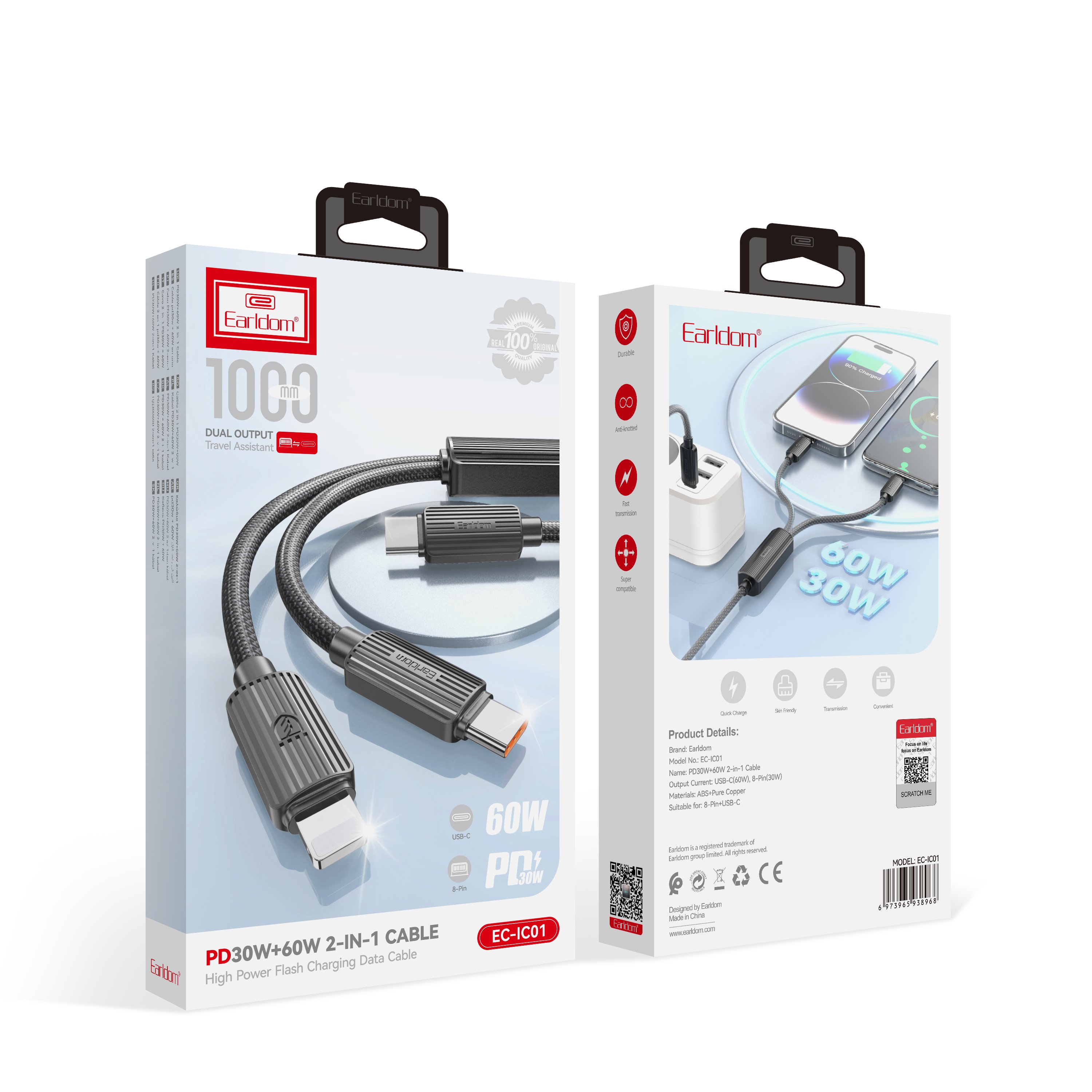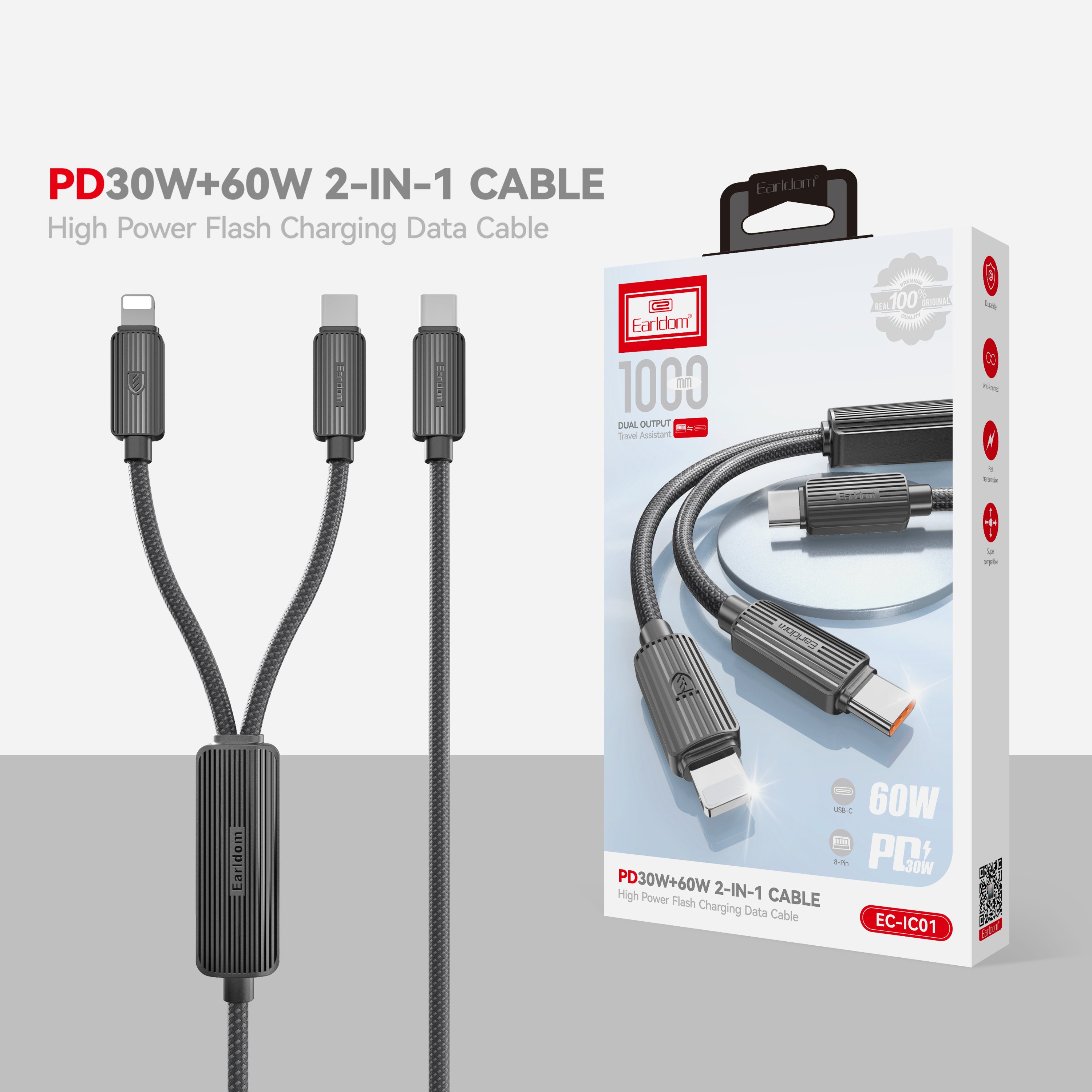 Earldom EC-IC01 1.2M Type-C to Type-C 60W ve Lightning 30W Çift Çıkışlı 2in1 PD Hızlı Şarj Kablosu
