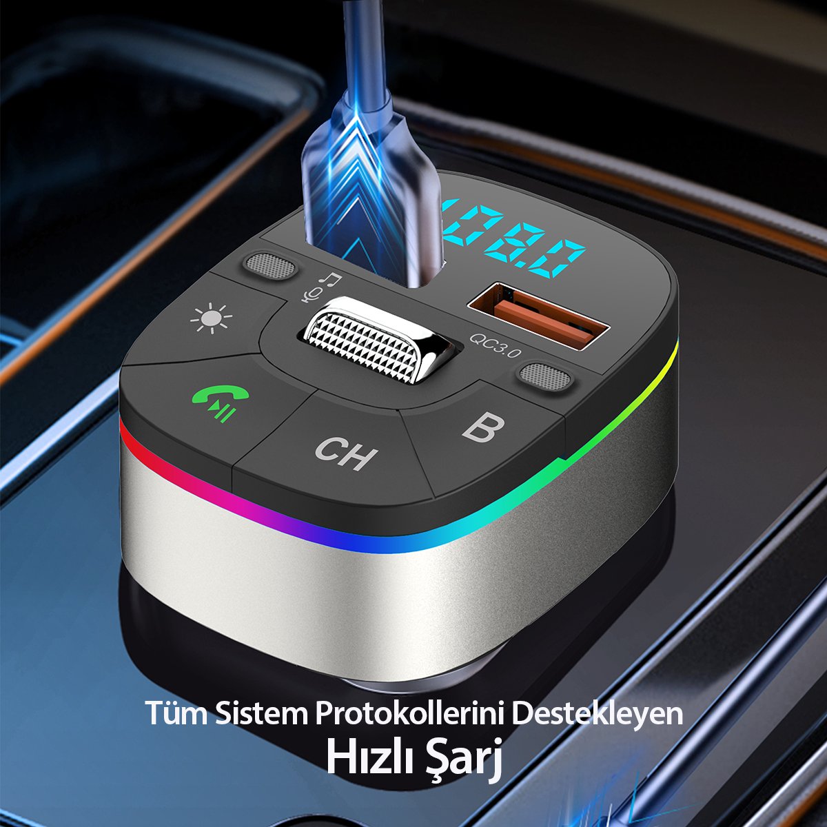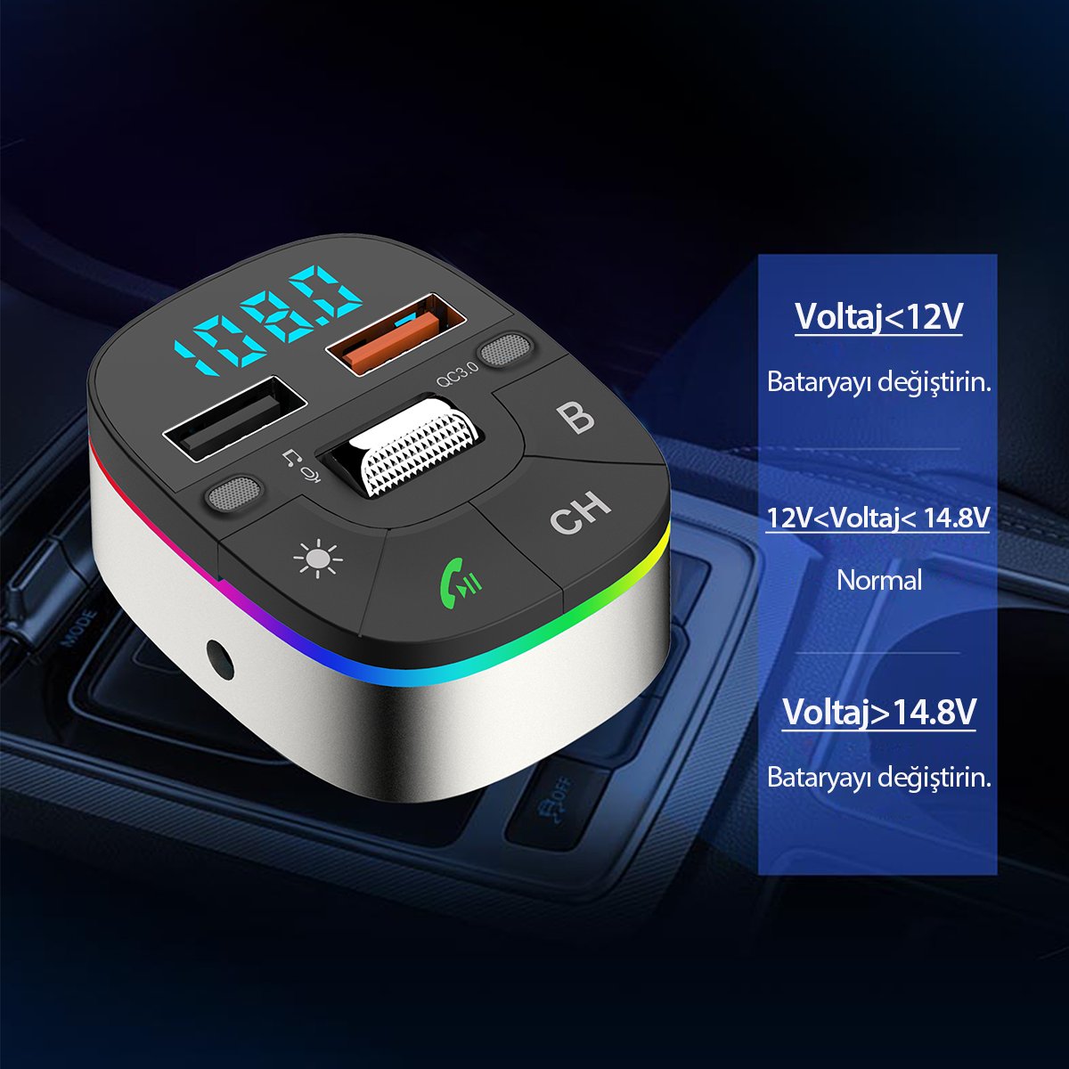 Bu özelliklere sahip bir araç Bluetooth müzik çalar ve şarj cihazıdır. Cihaz, Bluetooth V5.0 teknolojisine sahiptir ve otomatik bağlantı özelliği ile birlikte Bluetooth mesafesi 5 metre kadar uzunluğa sahiptir.