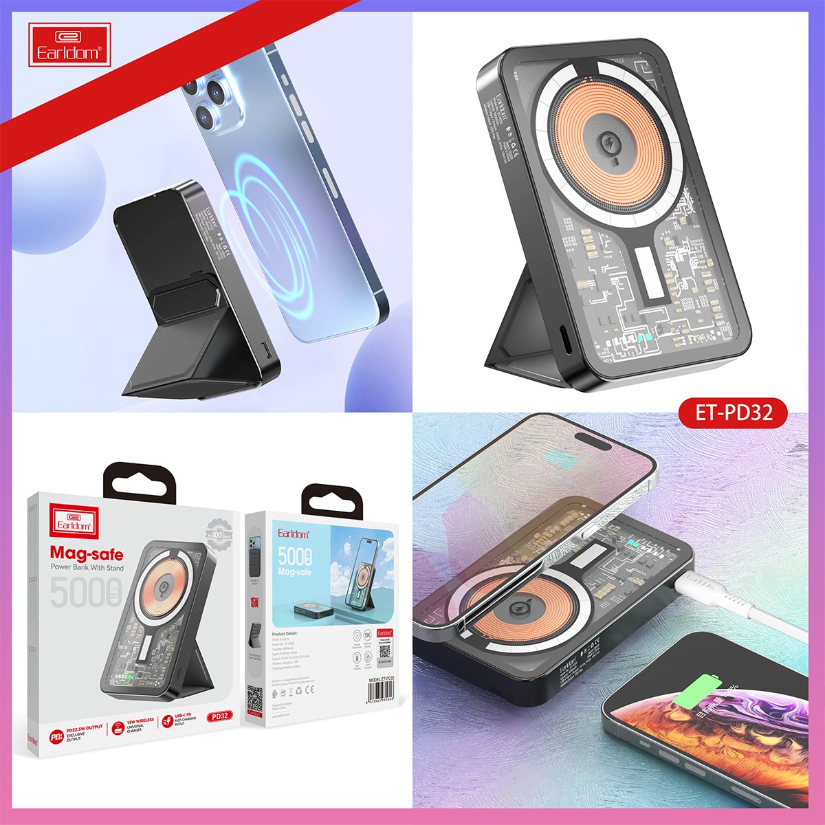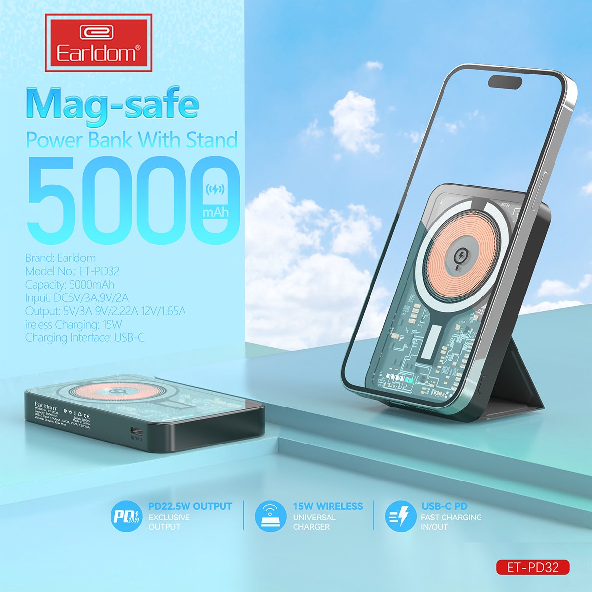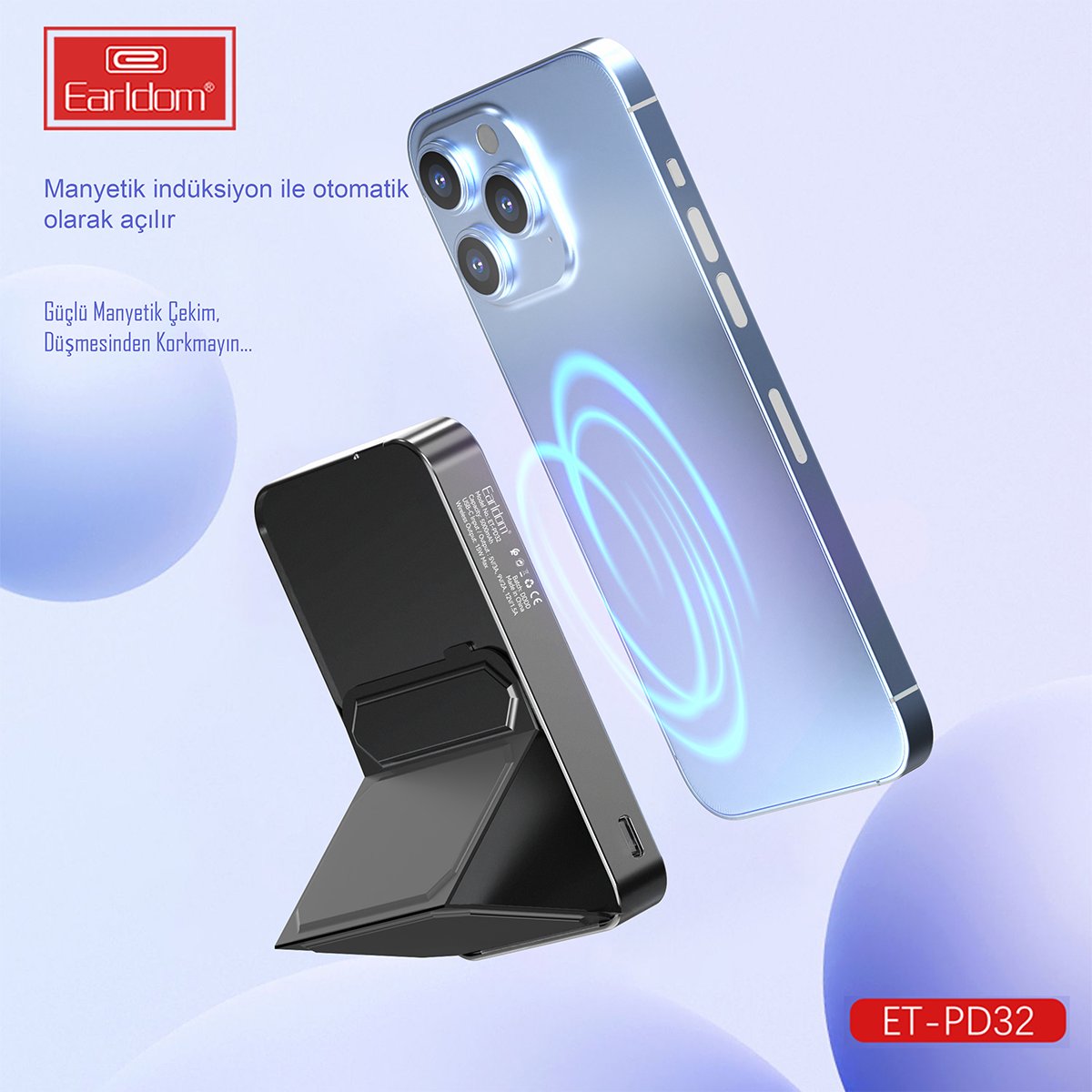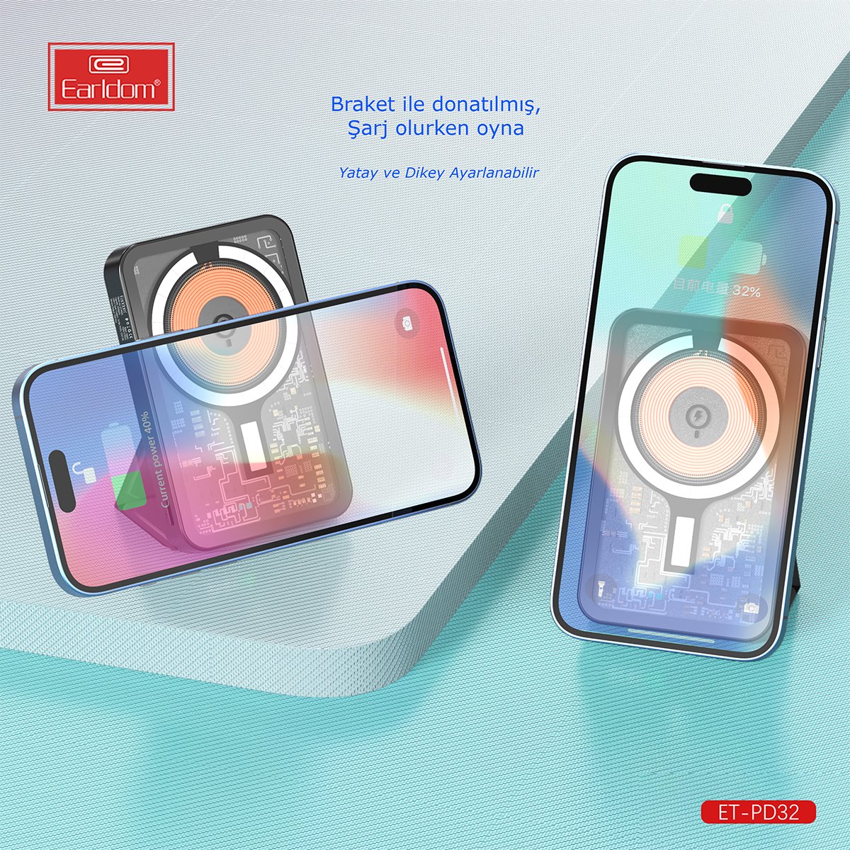 Earldom PD32 5.000 mAh 22.5W Kablosuz Şarjlı Standlı PD Hızlı Şarj Powerbank