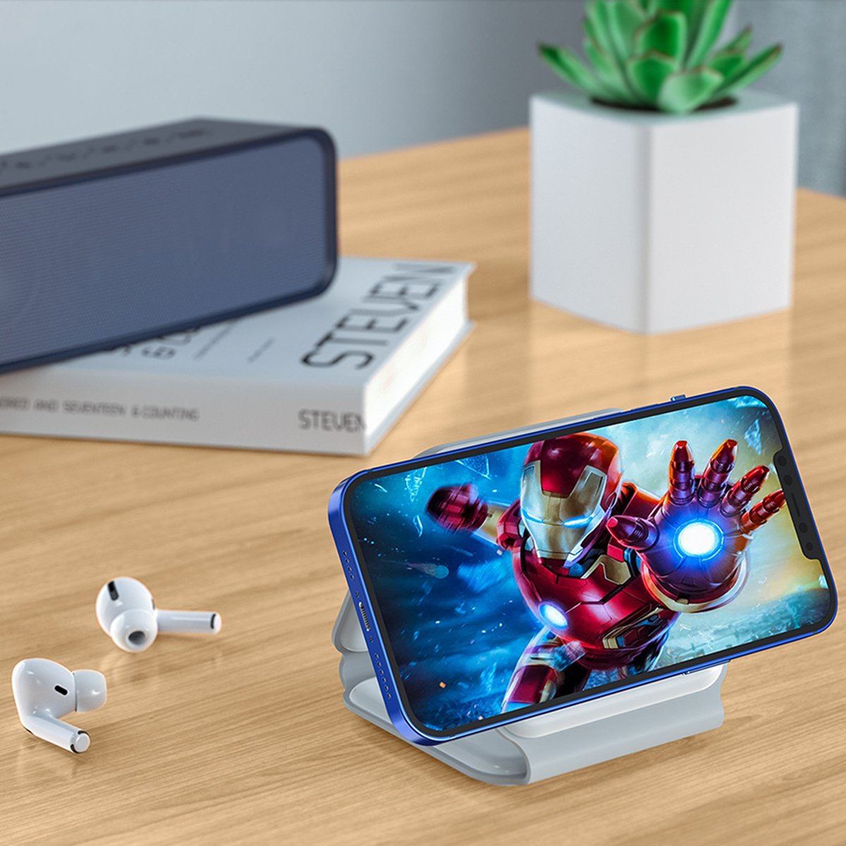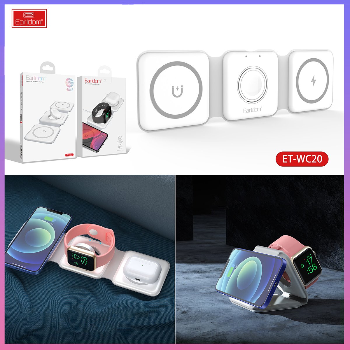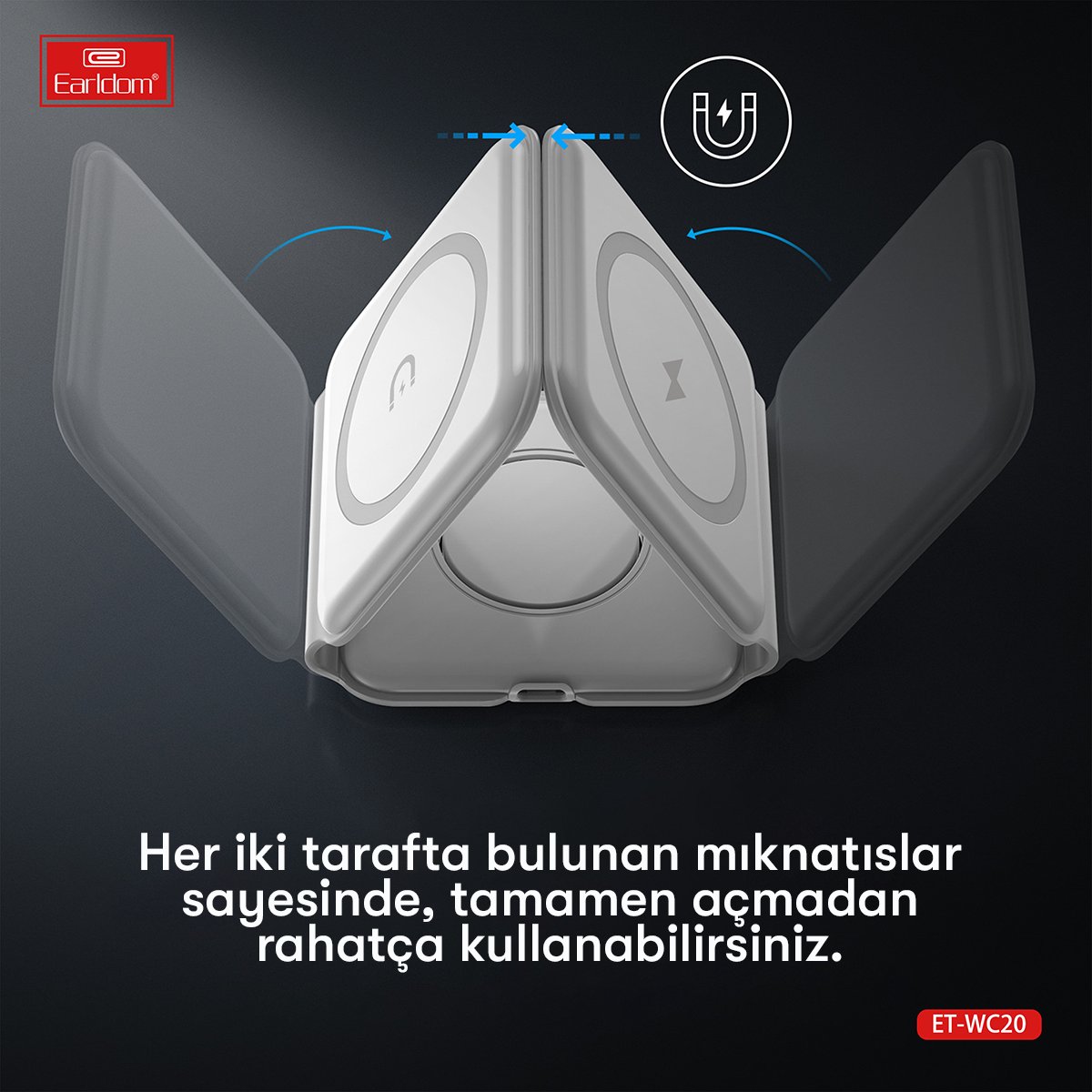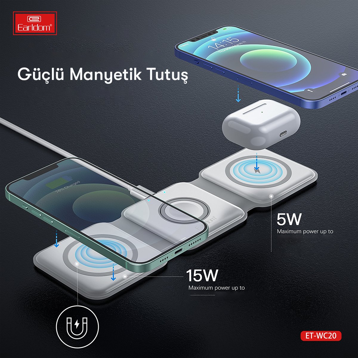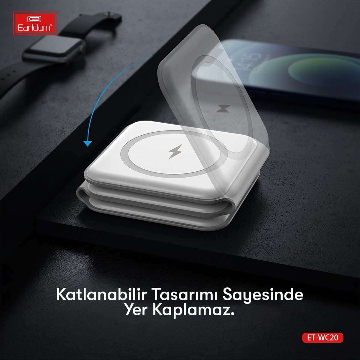 Earldom WC20, cihazlarınız için hızlı, düzenli ve pratik bir şarj deneyimi sunan katlanabilir bir masaüstü kablosuz şarj standıdır. Telefon, kulaklık ve akıllı saat gibi birden fazla cihazı aynı anda şarj edebilme kapasitesine sahip bu 3in1 şarj standı, minimalist ve katlanabilir yapısıyla alan tasarrufu sağlar ve çalışma masanızda düzenli bir görünüm sunar.