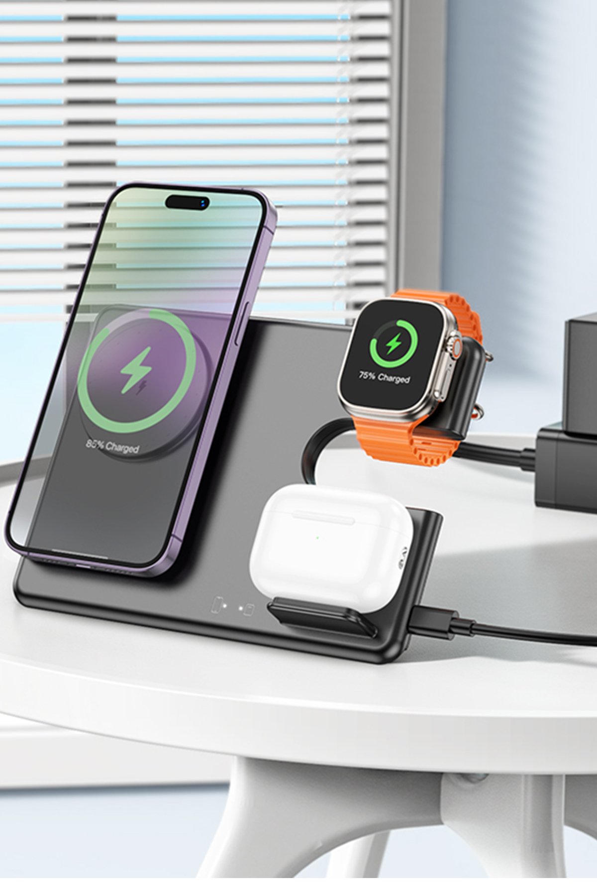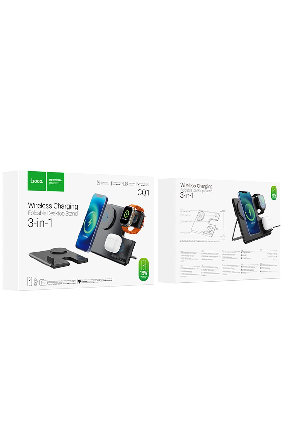 Hoco. CQ1, akıllı telefon, kablosuz kulaklık ve akıllı saatlerinizi aynı anda şarj edebileceğiniz kompakt ve işlevsel bir şarj çözümüdür. Modern tasarımı, güçlü şarj kapasitesi ve katlanabilir yapısıyla masaüstünüzde hem düzen hem de verimlilik sağlar.