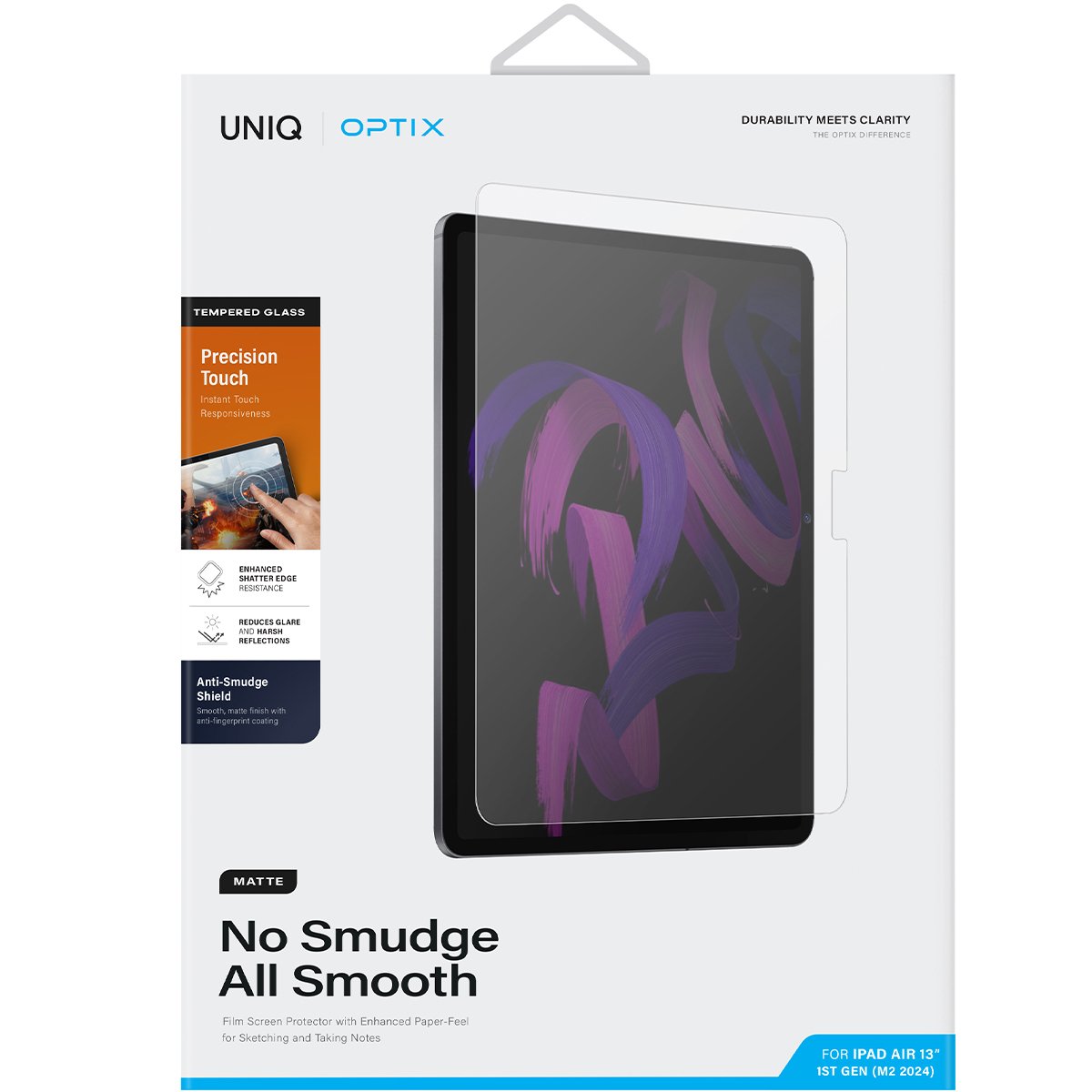 Uniq Optix Tablet Mat Ekran Koruyucu, tabletinizi çizilmelerden, parmak izlerinden ve yansımadan korurken aynı zamanda ekran netliğini ve dokunmatik hassasiyetini en üst düzeyde tutar.