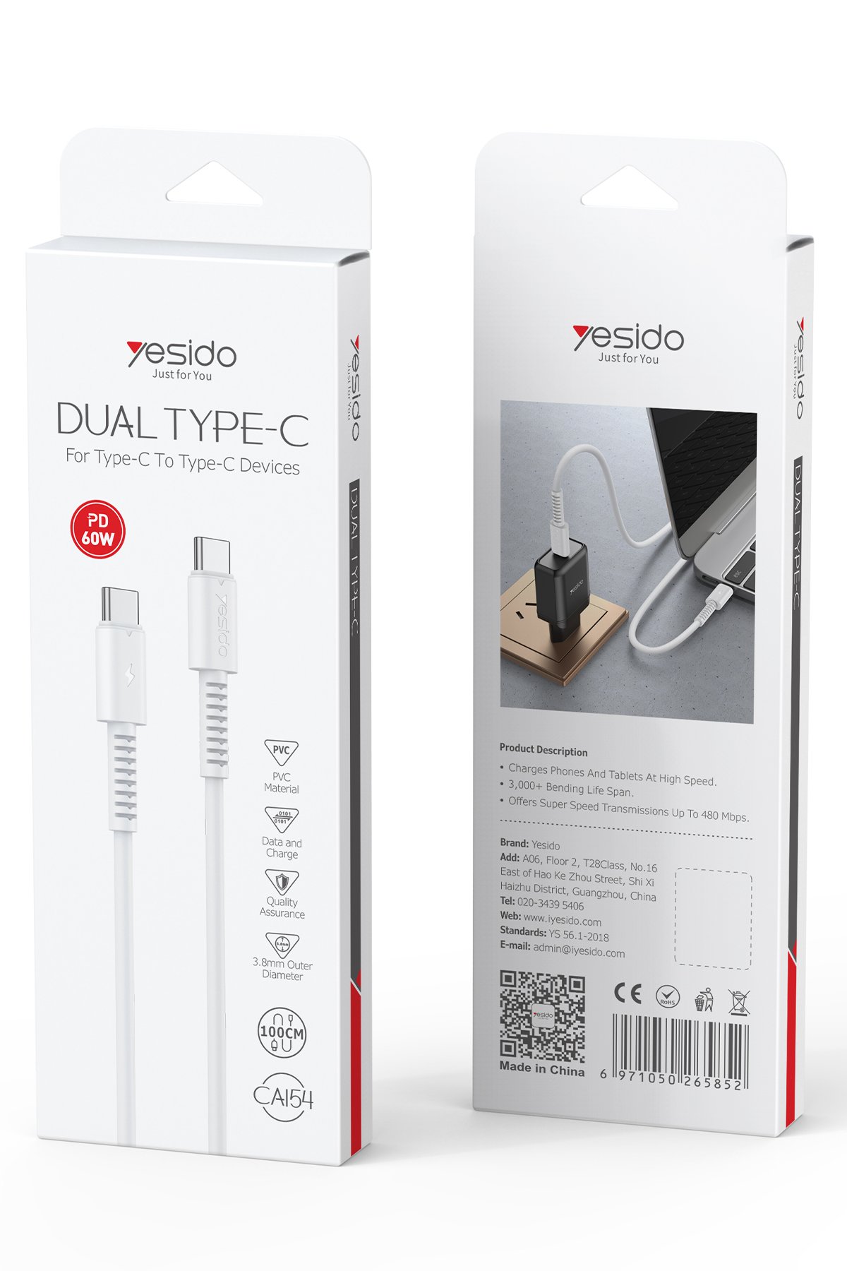 Yesido CA154 1M 60W Type-C to Type-C PD Hızlı Şarj Kablosu - Beyaz
