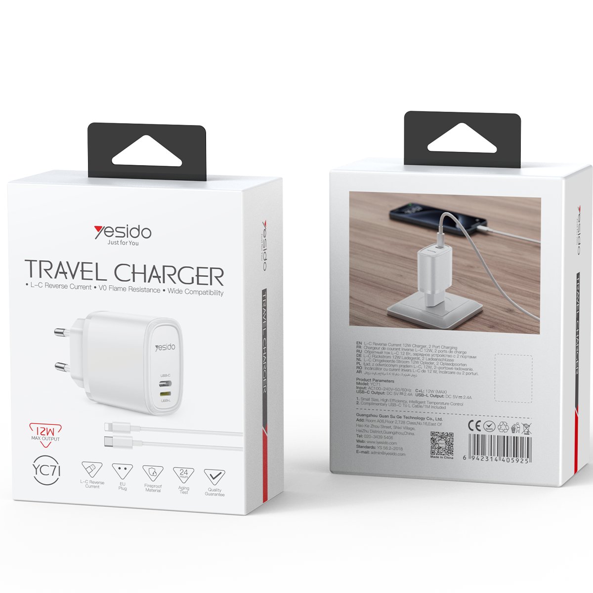 Yesido YC71 1 Adet 12W Type-C ve 1 Adet 12W Lightning Çıkışlı Ekstra 1M Type-C to Ligtning Kablolu PD Hızlı Şarj Cihazı