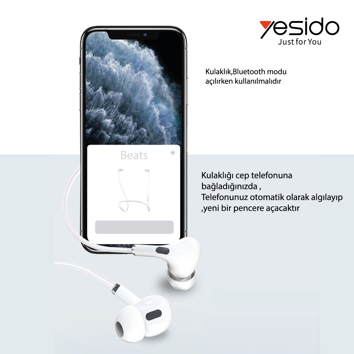 Yesido YH34 1.2M Yüksek Baslı Lightning Bluetooth Kablolu Kulaklık - Beyaz